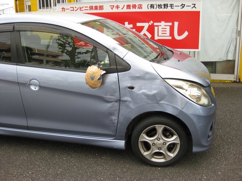 主な交換部品:フロントバンパー交換、ヘットライトユニット交換、フロントフェンダーパネル交換、フロントサスペンション脱着・分解・点検・調整、フロントサスペンションストラット交換、アルミホイール交換、フロントドアASSY交換、ドアミラー交換、スプラッシュガードASSY交換