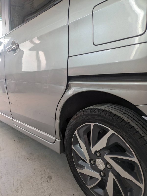 マツダ フレアワゴンにお乗りのお客様より助手席側の側面を外壁などにぶつけてしまい、激しく損傷しており、修理のご相談で来店をいただきました。板金が困難なパネルは部品交換を実施して元通りきれいに修理させていただきました。