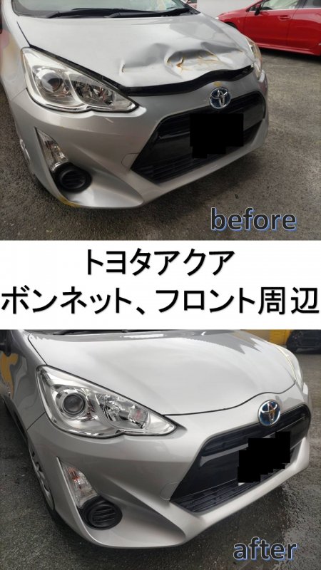 静岡県伊東市|アクア(トヨタ)のキズ・へこみ直し事例(ボンネット、左ヘッドライト、バンパー、左フェンダー、中古部品交換、内部骨格鈑金)
