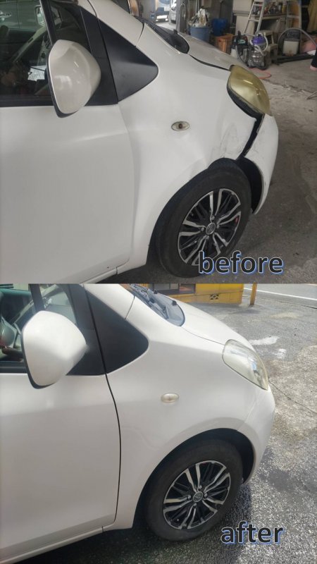 静岡県伊東市|ヴィッツ(トヨタ)のキズ・へこみ直し事例(右側フロントフェンダー中古部品、ヘッドライト修理、フロントバンパーキズへこみ修理になります。)