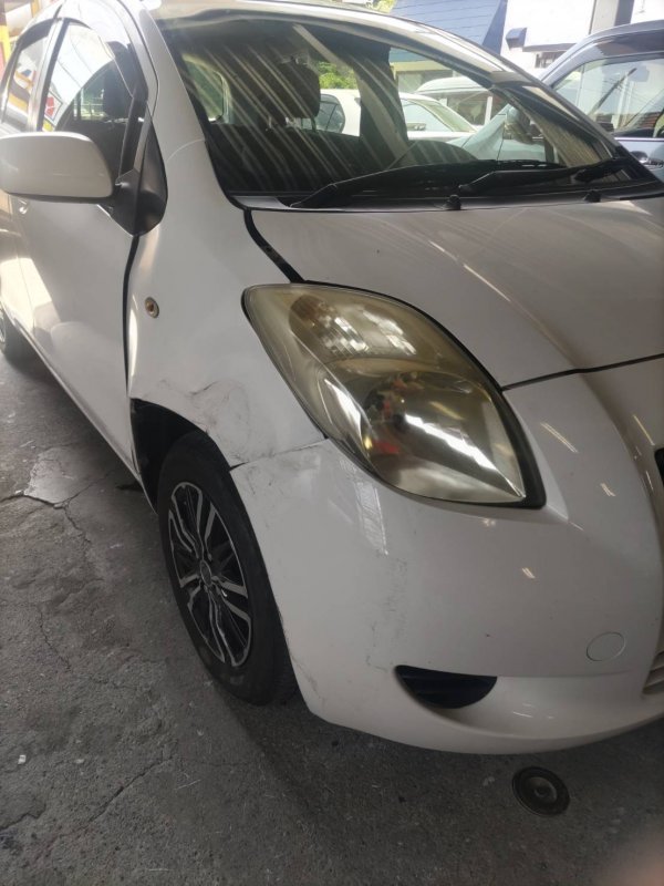 トヨタヴィッツ フロンフェンダー中古部品交換、右側ヘッドライト修理、フロントバンパーキズへこみ修理になります。