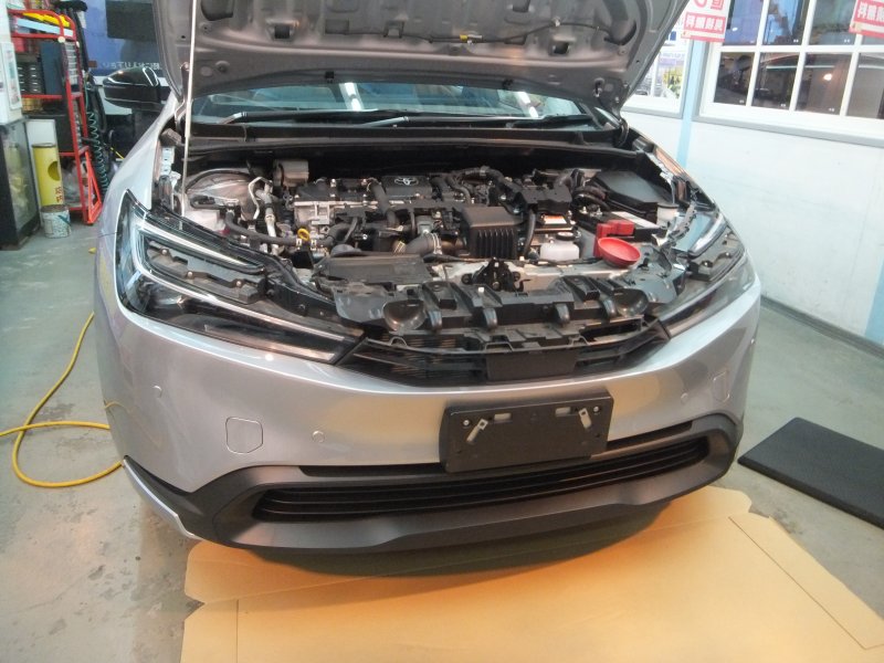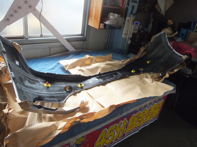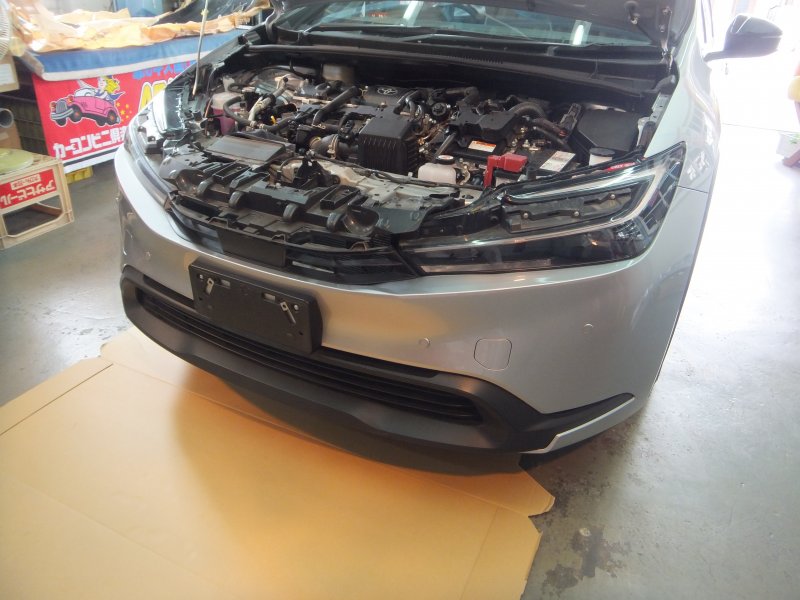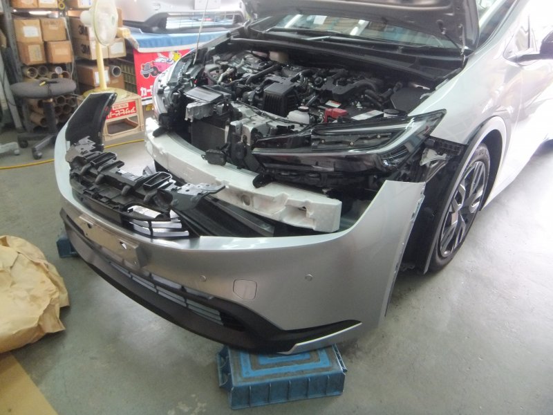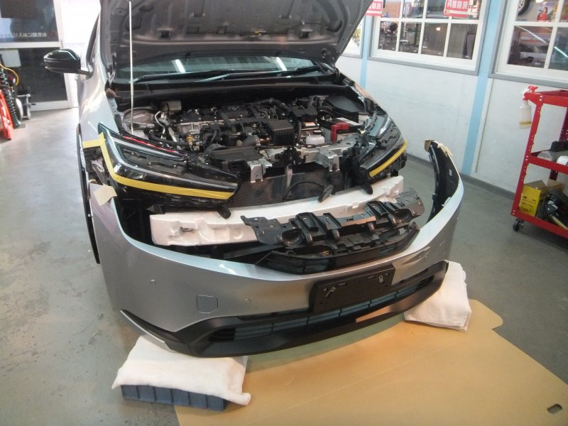 フロントバンパーとバンパーバーの破損ですので、交換作業になりました。