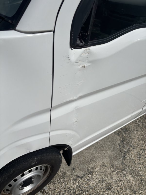エブリーにお乗りのお客様より助手席側のドアやフェンダーをブロック等にぶつけてしまい傷やヘコミが出来てしまい、修理のご相談でお越し頂きました。