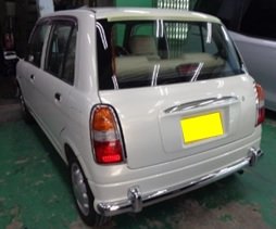 江戸川区 ダイハツ ミラジーノ リヤ廻り追突の鈑金塗装修理 リヤバンパー取替塗装・バックドア取替塗装・バックパネル取替塗装・リヤナンバー取替 左右テールランプ中古取替 ナンバーフレーム中古取替塗装