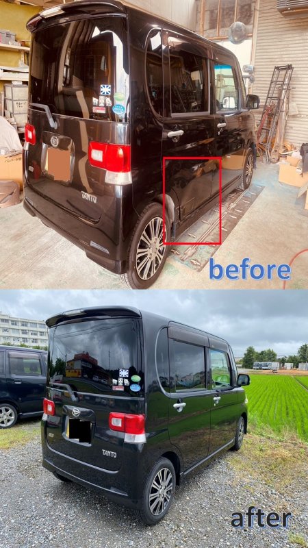ダイハツタント リヤドア、リヤフェンダー周辺、サイドステップ、キズへこみ修理になります。