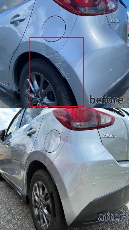 マツダデミオ リヤバンパーキズへこみ修理になります。