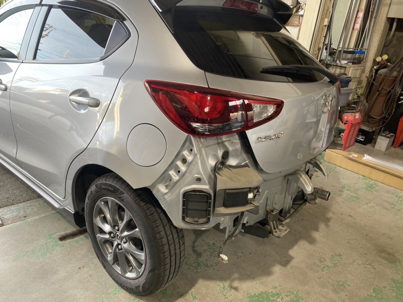 マツダデミオ リヤバンパーキズへこみ修理になります。