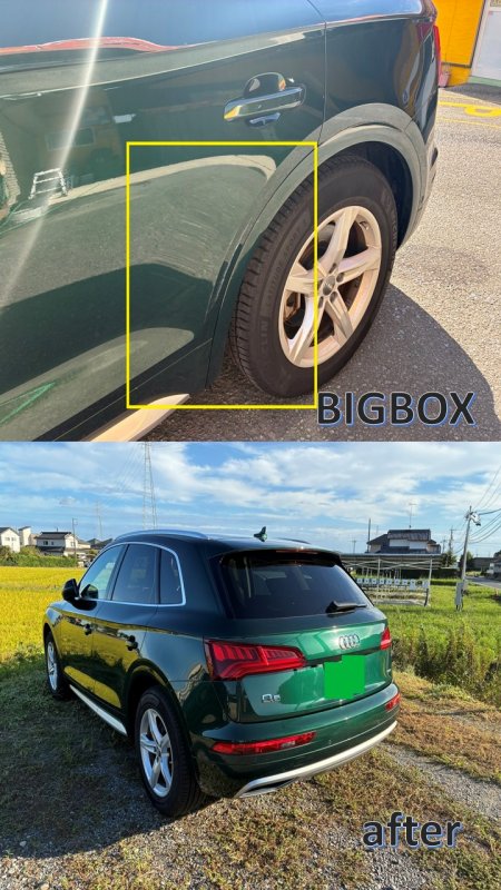 アウディQ5 左側リヤドア、リヤフェンダー周辺キズへこみ修理になります。