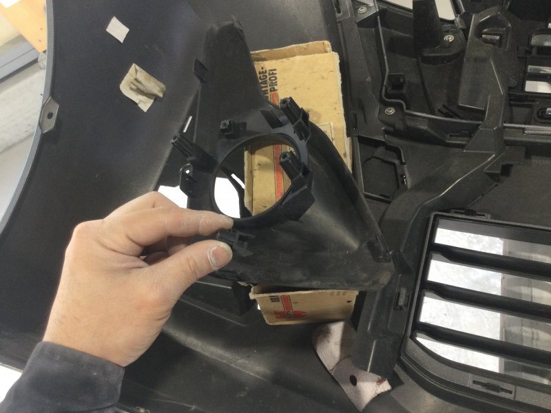 ぶつけた拍子にバンパーに穴が空いてしまってるのと、フォグランプのカバーの取り付けステーが折れていたので、2液性の強力な接着剤で穴埋め兼ステーをとめました。あとは上から下までキズがあったので、削り落として表面を慣らしています。