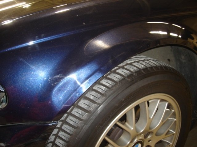 左側フロントフェンダーのヘコミです。アーチの部分が波打ってます。
