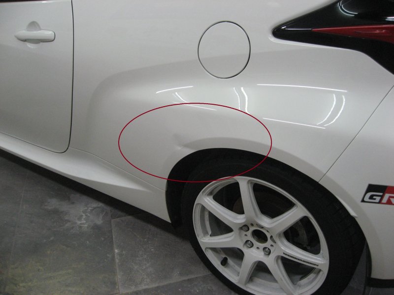 名古屋市名東区 千種区 守山区 長久手市 尾張旭市 トヨタGRヤリス左リアフェンダーキズ・へこみ修理事例