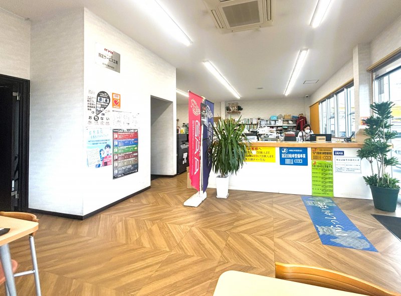 当店は、県道8号線に面しており、店鋪前面には広い駐車場を配備したご来店し易い店舗です。明るい受付フロアでの明朗会計はもちろん、ゆったりくつろげるスペースを設けておりますので、女性やご家族の方でもお気軽にお越しいただけます。また、最新の設備を整えており、あらゆるご依頼に対応致します。サービスは、小さなキズから大きなヘコミ修理、車検整備・一般修理、各種自動車保険の取り扱いまで、なんでもご相談いただけます。