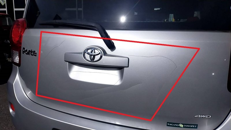 【長野県 中津川市 飯田市 下条村 喬木村 高森町 豊丘村 阿南町 阿南村 松川町】トヨタ・ポルテ、グレードX、平成25年3月式、DBA-NCP145 、リヤゲート(バックドア)キズ・ヘコミ修理作業事例、薄いキズ、すり傷擦れキズ、最新UV工法修理、新品交換したくない、修理費用を抑えたい、高額見積、リビルトパーツ使用、リサイクル部品使用、最安値、激安修理、代車無料、最短修理日数時間、安心安全鈑金修理