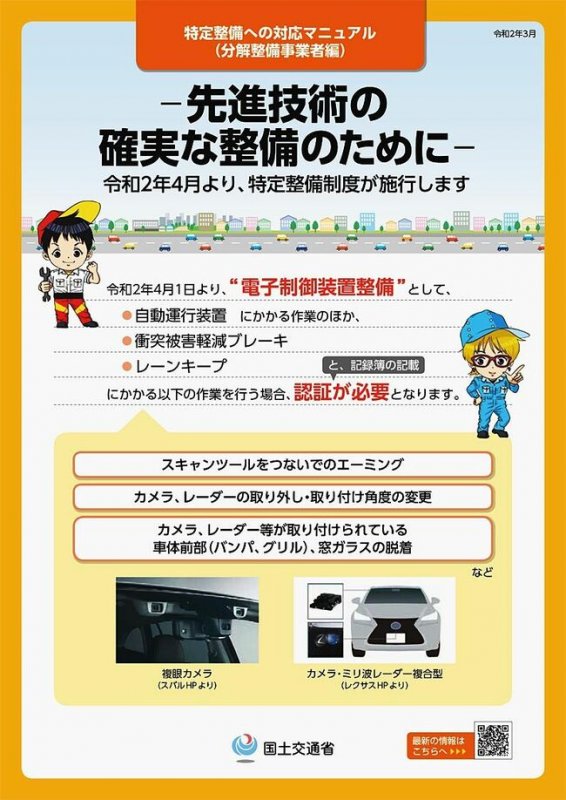 取り外しを伴わなくとも装置の作動に影響を及ぼす整備又は改造等の自動運転レベル3 以上の自動運転を行う自動車に搭載される「自動運行装置」の修理作業をする際に新たな制度として令和2年4月からスタートしており2024年4月より準備期間が満了し特定整備が義務付けられることになりました。