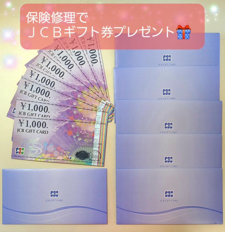 当店にて保険修理のご依頼をいただけましたら、JCBギフト券・家電製品・国内旅行など、豪華プレゼントをさせていただいております♪