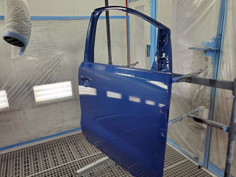 新品パネルは塗装がされていないので、お客様のお車のお色に塗装職人が調色をしたのち、塗装ブースの中で吹き付け塗装をします。