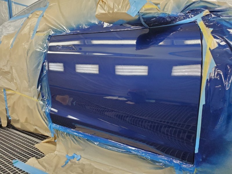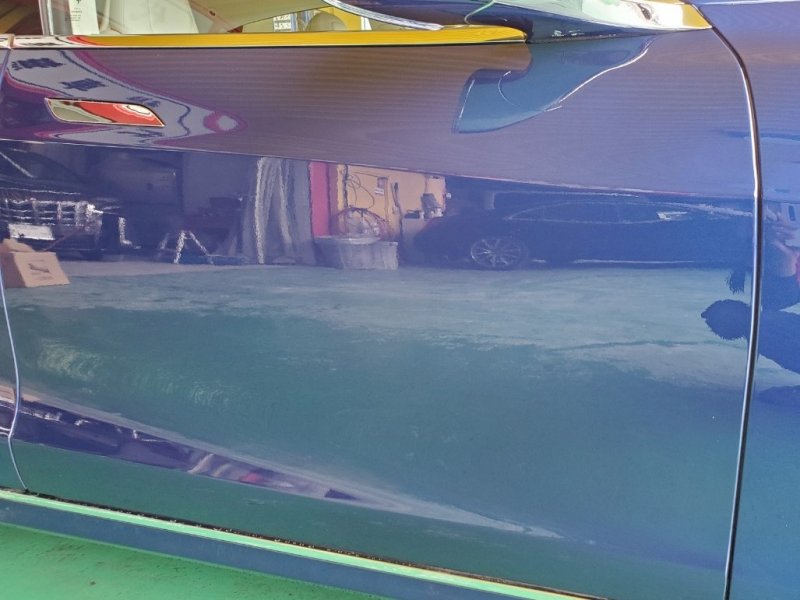 フロントドアのプレスライン上に薄っすらとヘコミが有りました。アルミボディーなので、普段のヘコミ直しと比べて作業が難しくなります。アルミボディーに損傷が有る場合は、交換を勧められることも多いと思いますが、パネル交換をすると部品代だけでも、かなり高額になります。特に外車の部品は、国産車に比べて高額な場合が多いです。