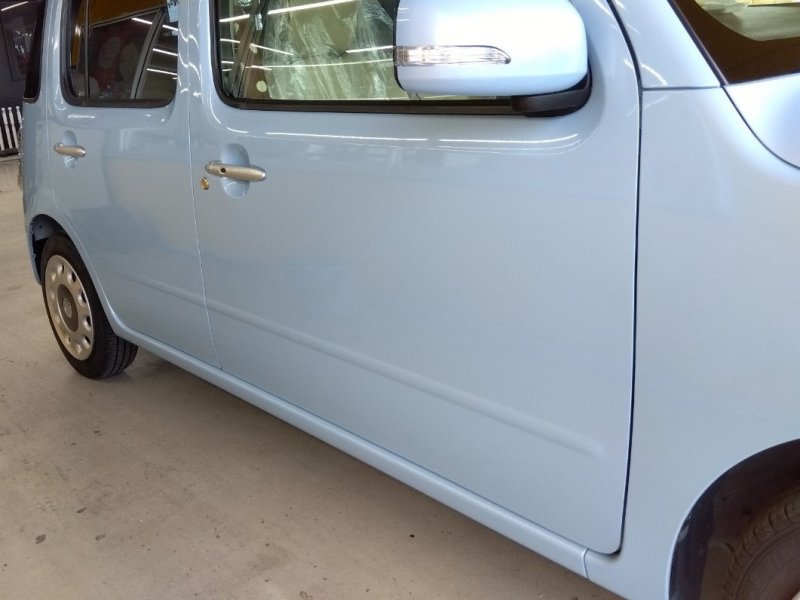 右リアドアと右リアフェンダー(クォーターパネル)は、鈑金塗装で直しました。ドアを開けた内側にも損傷がありましたので、こちらもキッチリ塗装をさせていただきました。