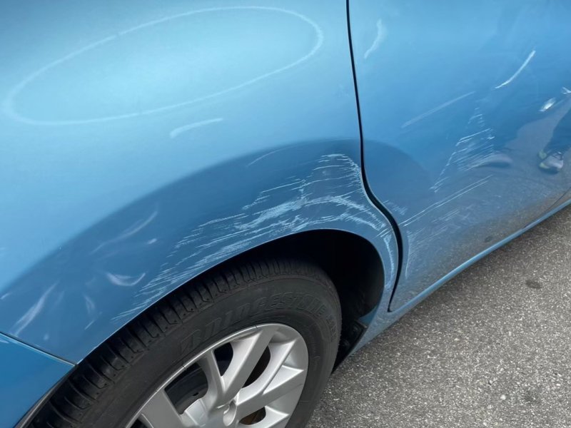 ドアとフェンダーに広範囲に白く目立った傷へこみがついていましたが鈑金塗装作業でキレイに直りました!