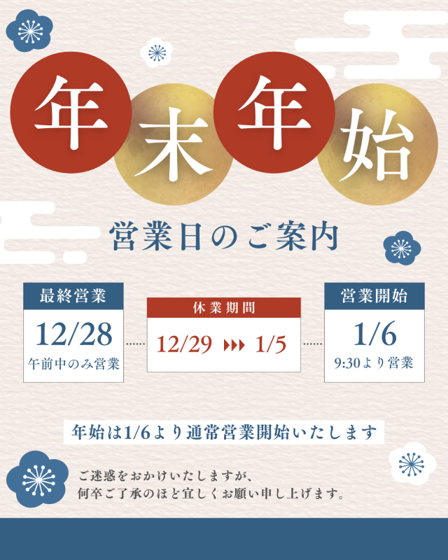 12月29日(月)~1月5日(月)までお休みさせて頂きます。
