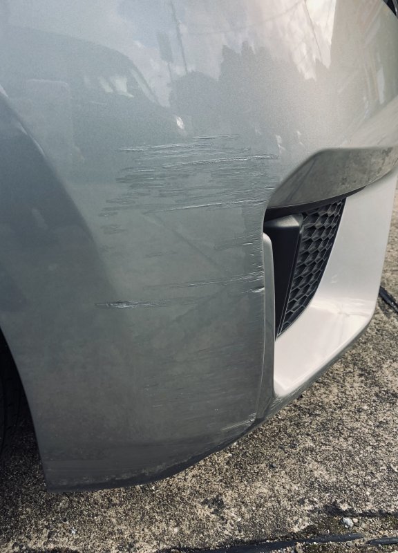 フロントバンパーを縁石ブロック等に当ててしまい修理のご相談でご来店頂きました。