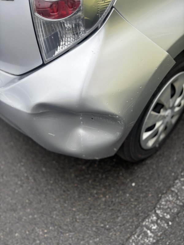 トヨタアクアにお乗りのお客様よりリアバンパーを壁にぶつけてしまい、大きな変形が出来たため、修理のご依頼で来店頂きました。