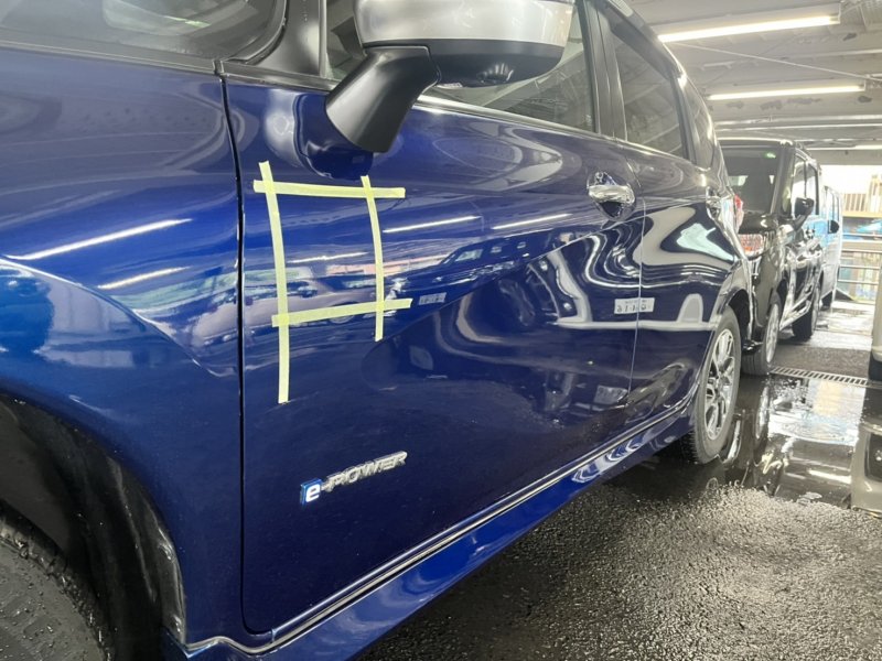 ニッサンノートの左フロントドアの損傷でご来店いただきました。