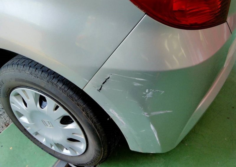 当店のホームページを見て、ご来店、ホンダ・フィット リアバンパー・クォーターパネルへこみ修理の依頼をいただきました。