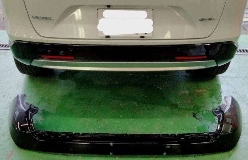 当店のホームページを見て、ご来店、ヴェゼル・リアバンパー修理の依頼をいただきました。