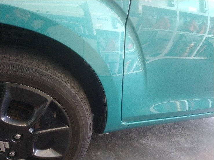 右リアタイヤ上部分(フェンダー・ドア)のキズ・ヘコミ修理でお依頼を受けました。修理期間4日間。価格69000円です。