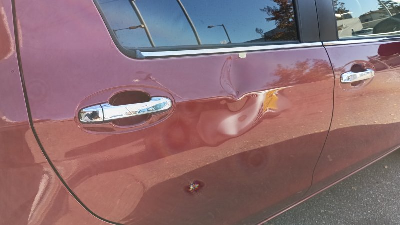 トヨタのヴィッツで右後ろドアのへこみ修理で入庫しました。