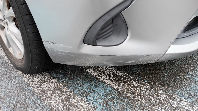 マツダのデミオでフロントバンパーを擦ってしまい修理で入庫しました。