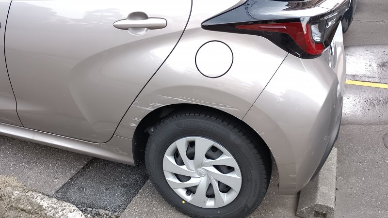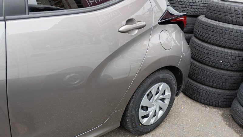 石川県 金沢市 車 トヨタ アクア 左リアドア クォーター リアバンパー 傷 へこみ 板金 塗装 修理
