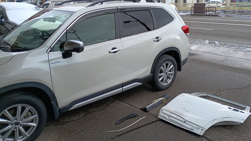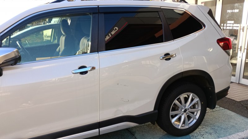 石川県 金沢市 車 スバル フォレスター 左リヤドア 傷 へこみ 新品 部品 交換