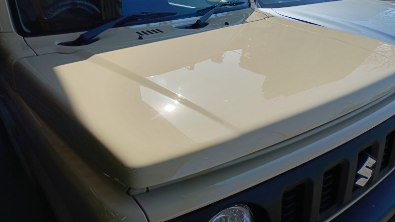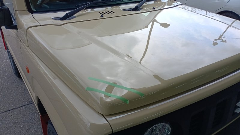 スズキのジムニーでボンネットのへこみ修理で入庫しました。