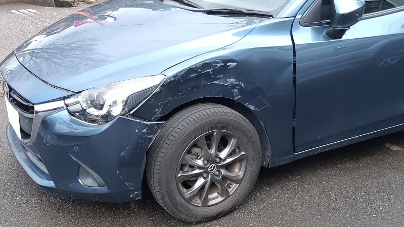 石川県 金沢市 車 マツダ デミオ 左前 傷 へこみ 部品 交換