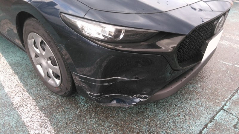 マツダのマツダ3でフロントバンパーの修理で入庫しました。