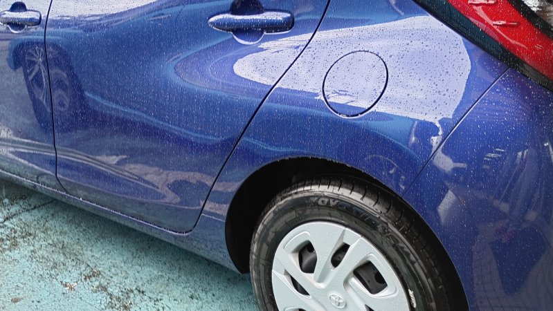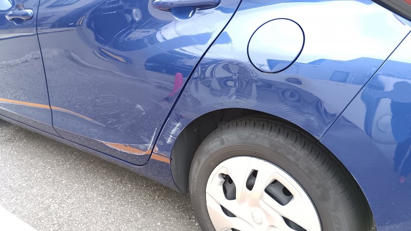 石川県 金沢市 車 トヨタ アクア 左クォーター リヤドア 傷 へこみ 板金 塗装 修理