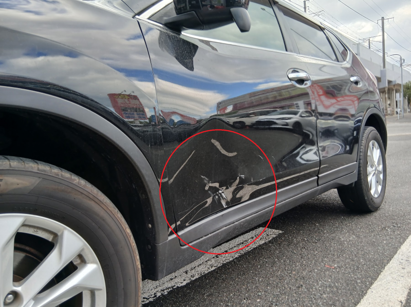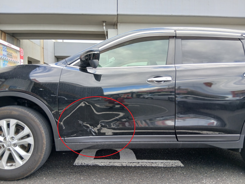 左側面を損傷した日産 エクストレイルの修理事例です。 左フロントドアが強く押し込まれていたため、ドアは新品交換で対応しました。 あわせて周辺パネルおよびサイドシルパネルにも損傷があったため、鈑金修理を行っています。