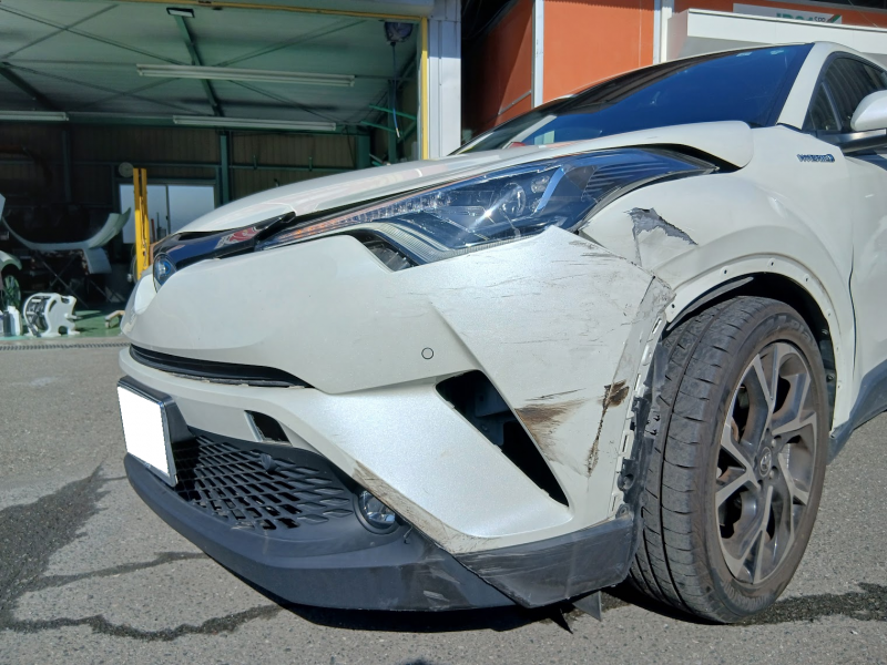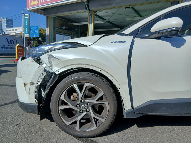 左フロントを大きく損傷したトヨタ C-HRの修理事例です。 外装部品の交換とあわせて、内部の骨格修正も行う大きな修理となりました。