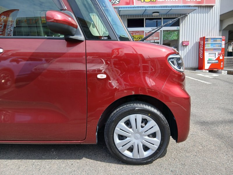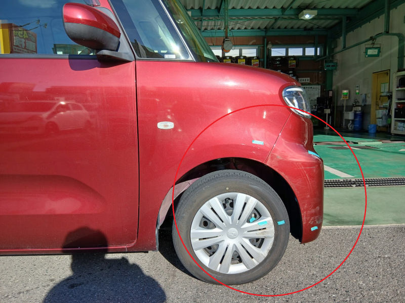 福岡西小戸店で、タントの左フロント周りの修理を行いました。バンパー交換やフェンダー修理に加え、足回りにも損傷があったためタイヤ・ホイール交換、サスペンションアーム類の一部交換・調整も実施しました。