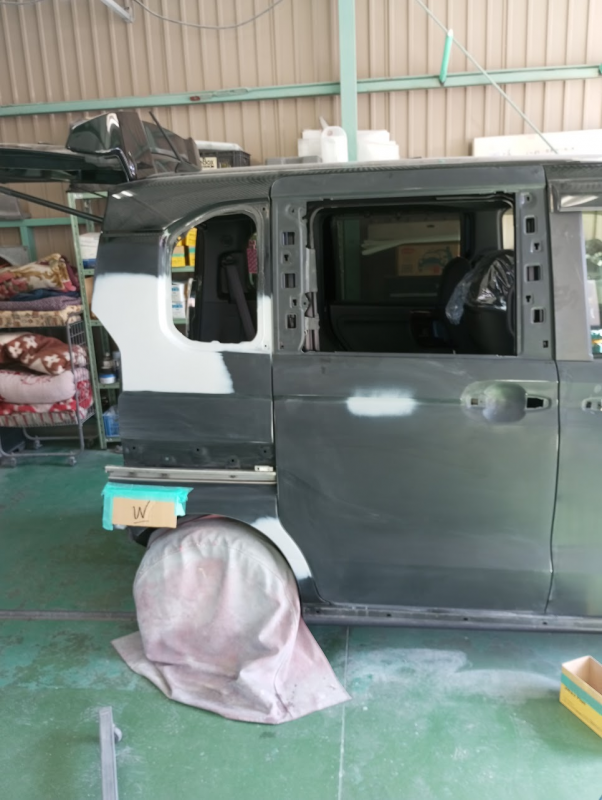 福岡西小戸店で、N-BOXの左側面(リアドア・クォーターパネル・リアバンパー)の交換修理を行いました。左側面が大きく損傷していたため、主要パネルはすべて新品交換となり、テールランプまで交換した広範囲の修理です。