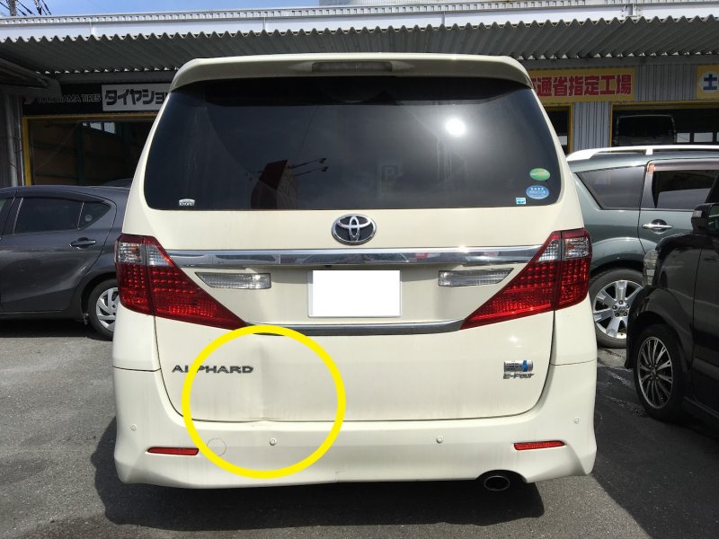 福岡県糟屋郡久山町|アルファード(トヨタ)のキズ・へこみ直し事例(リヤバンパー ゲートへこみきず 交換保険)