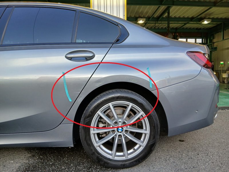 福岡県糟屋郡久山町|3シリーズ(BMW)のキズ・へこみ直し事例(リアドア、クォーターパネル板金修理)