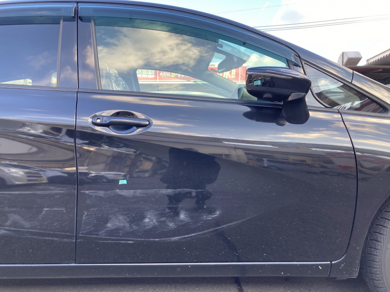 日産 ノート 右側面事故修理事例(ドア交換・鈑金修理)