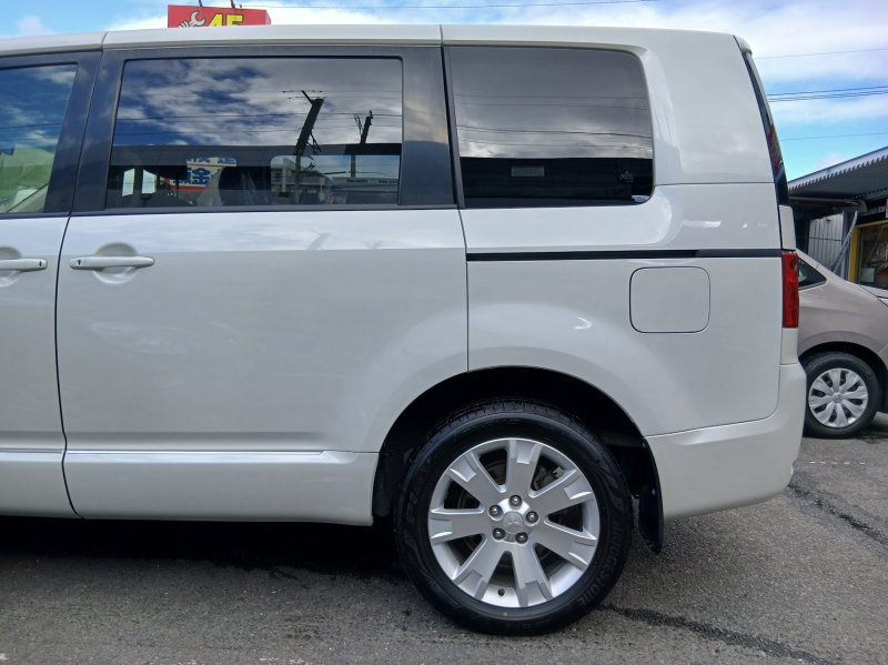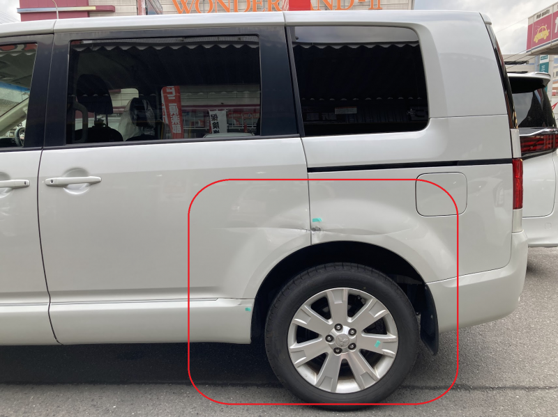 左側後方を損傷した三菱 デリカの修理事例です。左リアドアとクォーターパネルは鈑金塗装で対応し、ホイールは交換となりました。