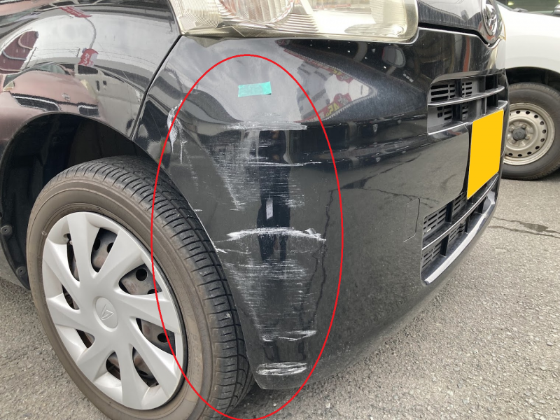 フロントバンパーを損傷したダイハツ タントの修理事例です。今回は交換ではなく、鈑金修理にて対応しました。