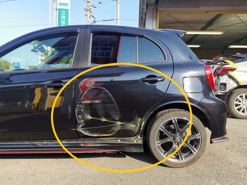 福岡県福岡市城南区|マーチ(日産)のキズ・へこみ直し事例(左リヤドア クォータ サイドシルへこみ修理 保険対応)