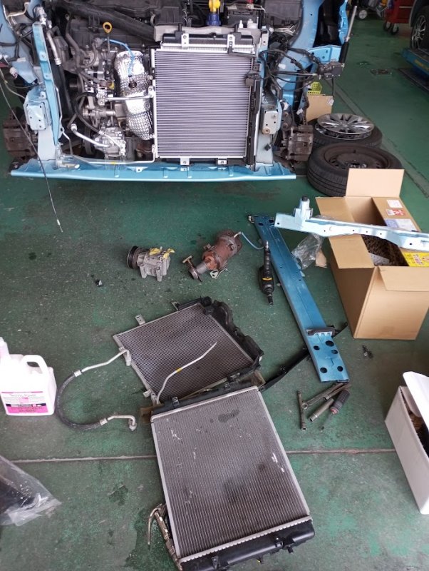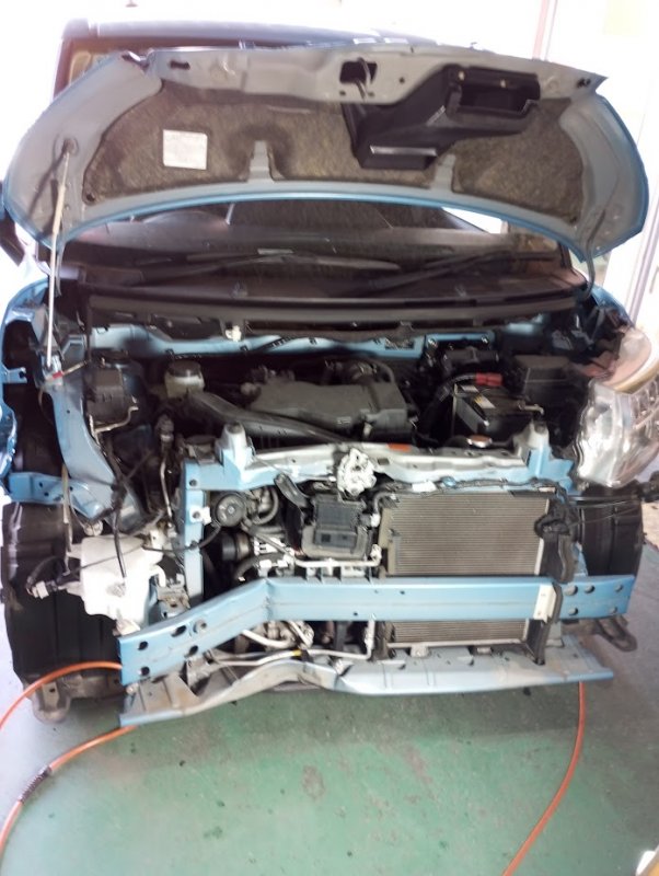 前回りに全体に大きなダメージがあり、バンパーは落ちて、ライトやフード、左右フェンダーまで損傷していました。