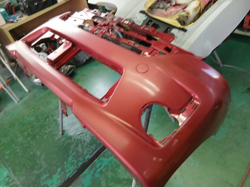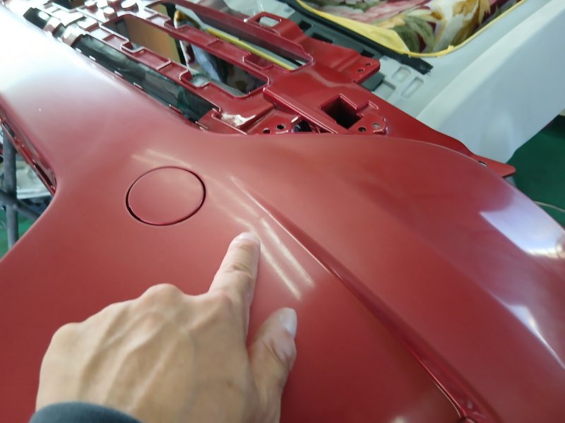 こういう場合は一度バンパーを取り外して分解後に全体を磨き上げて変形を修正して再塗装になります。